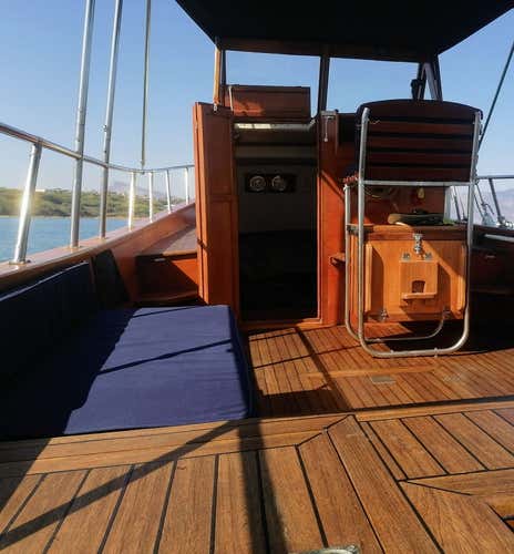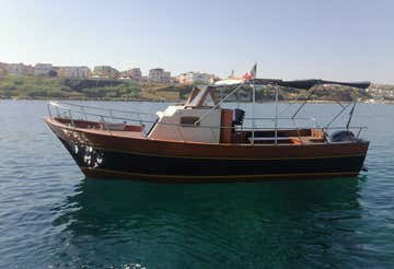 L'imbarcazione è un gozzo in legno lungo 7,5 metri dotato di tendalino, doccetta esterna e servizio igienico.
