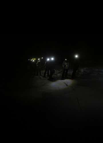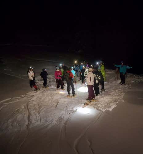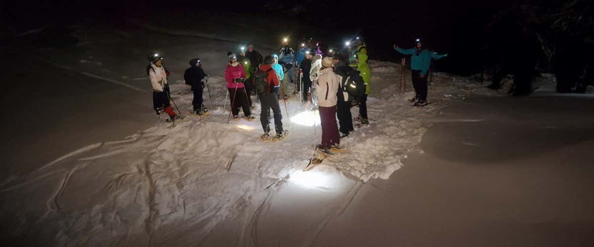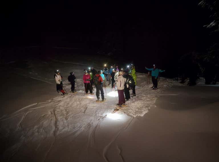 Qui ci verranno consegnate le racchette da neve, i bastoncini e la torcia frontale e parteciperemo a un breve briefing tecnico, per imparare come muoverci in sicurezza sulla neve di notte.