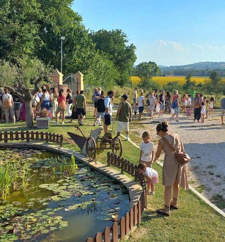 Poi parteciperemo a una degustazione guidata di prodotti come olio, lavanda, tartufo, formaggi e diverse varietà di miele, tra cui acacia, castagno, ciliegio e il rarissimo ailanto. Il tutto sarà accompagnato da acqua aromatizzata, idromele, vino o birra, a seconda delle nostre preferenze.