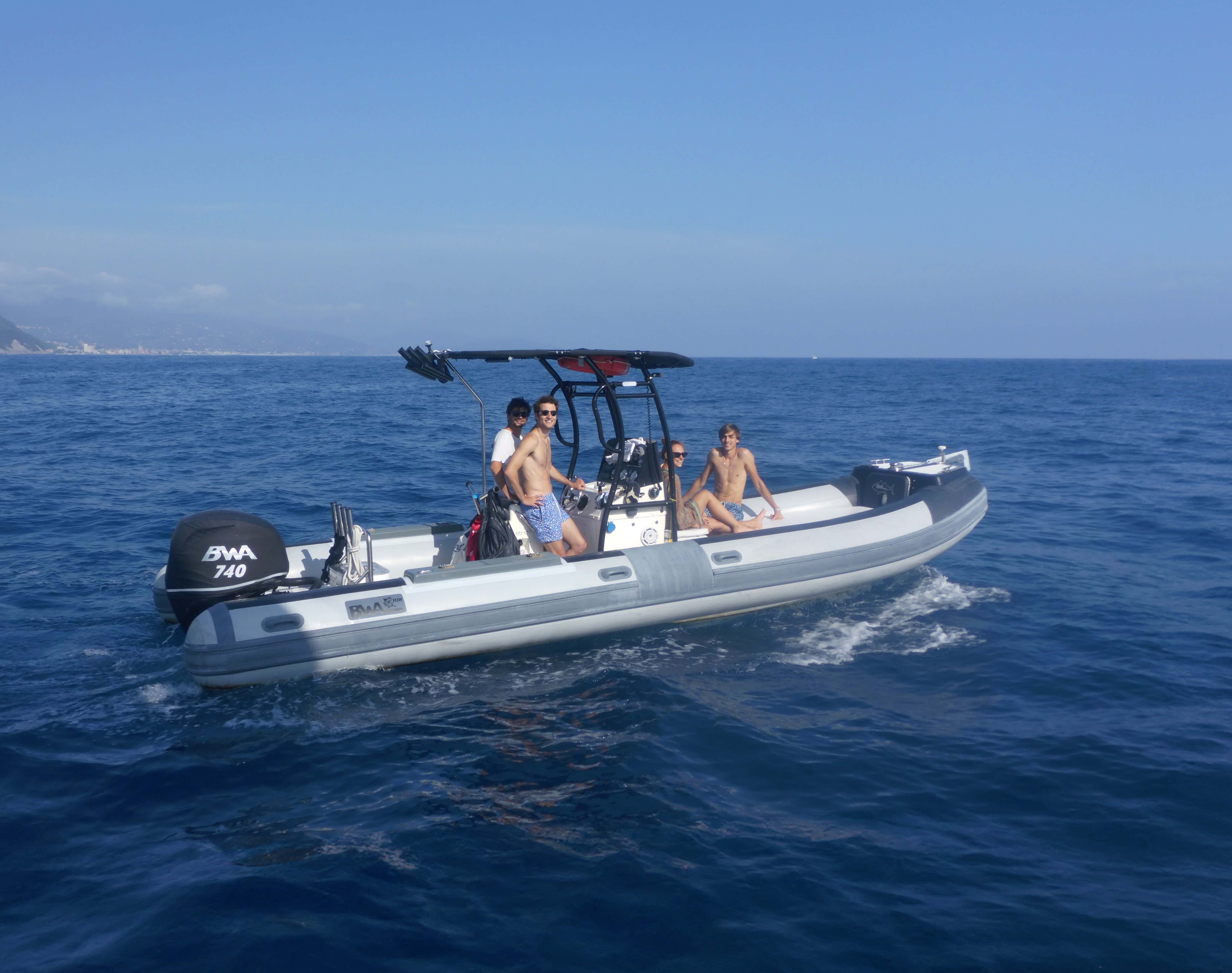 L'escursione si svolge a bordo del gommone BWA 740, 7,4 m di lunghezza e motore 175 CV Mercury, dotato di piccola copertura per creare una zona ombreggiata e doccetta d’acqua dolce.