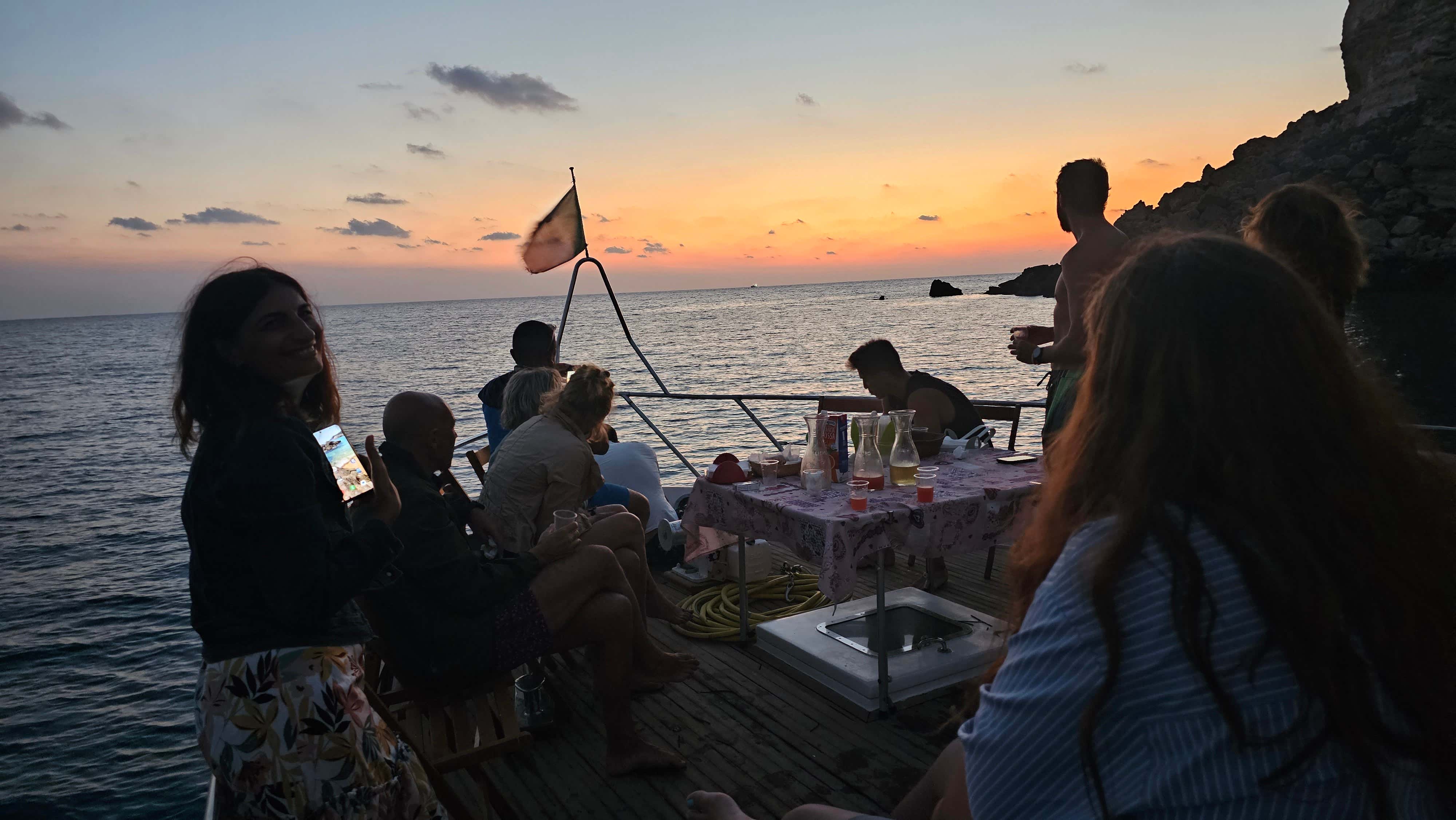 Mentre termineremo di assaggiare la sfiziosità serviteci dal comandante, verremo avvolti dalle luci del tramonto e, giunto il momento del crepuscolo, accoglieremo la sera facendo un tuffo in mare.