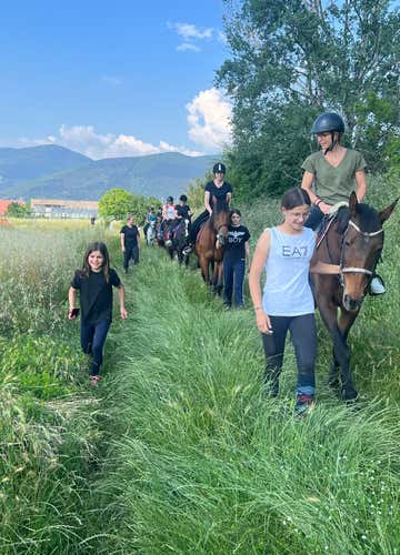 Successivamente monterete in sella e proverete l'emozione unica di cavalcare un pony o un cavallo! Seguirà una breve passeggiata su pony o cavallo, all'interno della proprietà o nei dintorni a discrezione dell'istruttore, garantendo massima sicurezza e spensieratezza. Adulti e bambini monteranno in sella in momenti diversi per garantire il giusto supporto dell'istruttore; ciascun partecipante sarà coinvolto anche quando non sarà il suo turno di montare in sella. Questa parte ha durata 20 minuti circa.