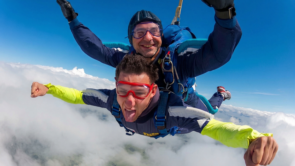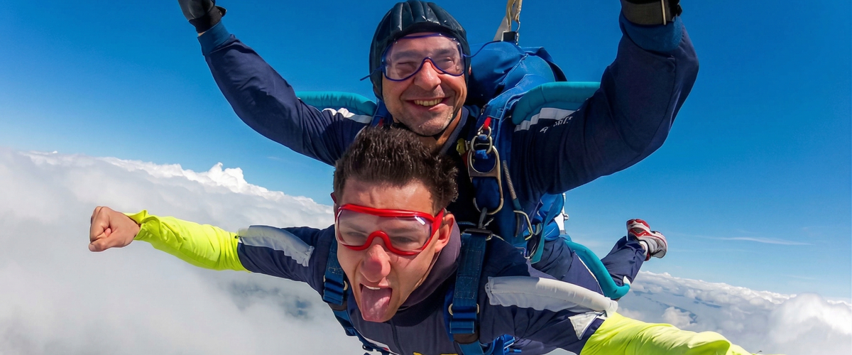 Raggiunti i 4.000 metri di altitudine, insieme all'istruttore ti posizionai alla porta dell’aereo, pronto al lancio. Un respiro profondo, il cuore che batte forte, e… via! Vi lancerete insieme nel vuoto per 60 secondi di caduta libera a circa 200 km/h: adrenalina allo stato puro.