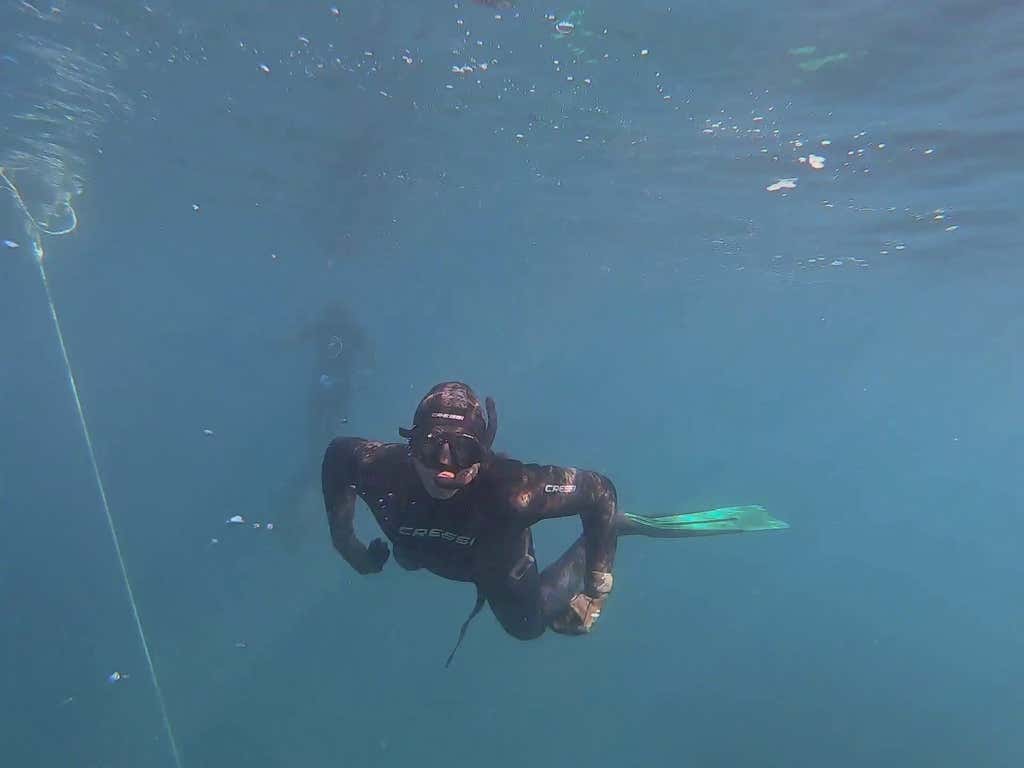 Dopo la vestizione, ci sposteremo verso il punto d'immersione, trasportando tutto con un SUP fino a una boa di ancoraggio, a circa 200 metri dalla riva. Arrivati sul posto, inizieremo con alcuni esercizi preparatori, tra cui la tecnica di capovolta e i primi tentativi di discesa.
