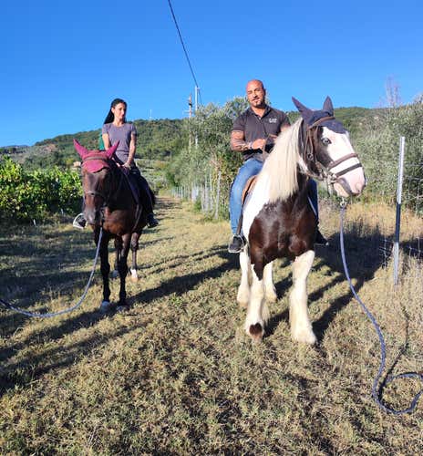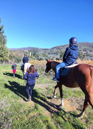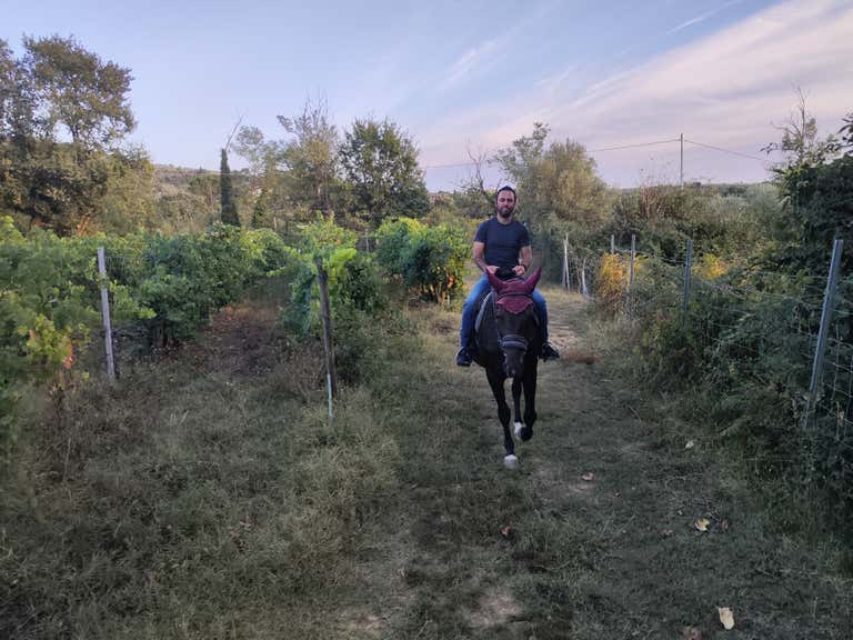 Al termine della lezione, saremo pronti per la nostra passeggiata a cavallo: percorreremo un giro ad anello nei dintorni della tenuta, avventurandoci su sentiero e sterrato tra uliveti, vigneti e boschi. Ti seguirò a piedi per l'intera passeggiata, tenendoti con una lunghina che allenterò fino a che non avrai il pieno controllo del cavallo!