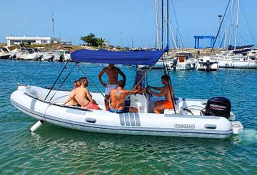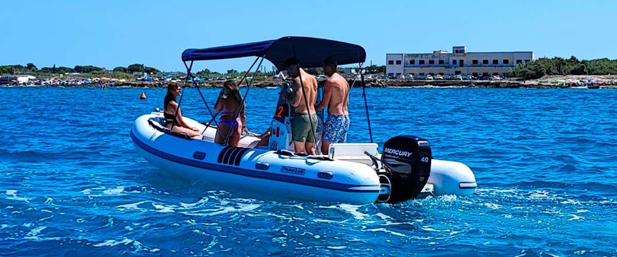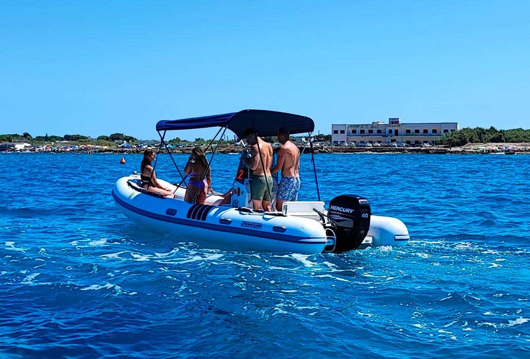 Una volta pronti, salperete dal porto per esplorare in autonomia le calette. Potrete dirigervi verso sud per ammirare le rovine di Roca Vecchia o ancorarvi davanti alle spiagge dorate di Torre Sant'Andrea. Il gommone è dotato di tendalino parasole per proteggervi nelle ore calde e di una comoda scaletta per risalire a bordo dopo il bagno.