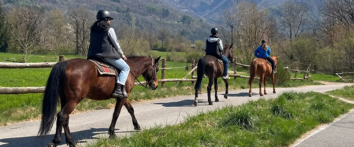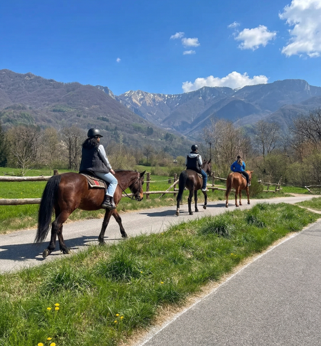 Ed ecco che avrà inizio la passeggiata a cavallo: cavalcherete in una splendida cornice naturale all'ombra della montagna, percorrendo un'ippovia che costeggia il fiume Pioverna. Vi addentrerete in boschi, guaderete corsi d'acqua e godrete della vista panoramica sul Gruppo delle Grigne e i Piani di Bobbio!