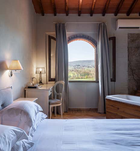 All'accoglienza riceverete le chiavi della vostra Camera Deluxe: l'alloggio misura 25 mq e si compone di camera da letto matrimoniale (dotata di riscaldamento, climatizzatore, connessione Wi-Fi, biancheria da letto, cassaforte, TV, minibar, bollitore elettrico, selezione di tè e caffè) e bagno privato (dotato di servizio igienico, doccia o vasca, asciugacapelli, biancheria da bagno e prodotti per l'igiene personale). La vera chicca è la vasca idromassaggio in camera, con vista panoramica sulle colline della Val d'Elsa!