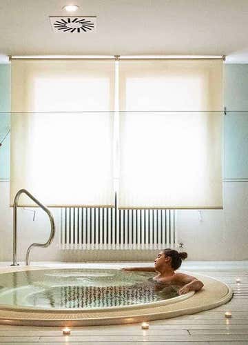 Al nostro arrivo ci recheremo in spogliatoio e cambieremo per l'occasione. Potremo dunque accedere alla spa: questa si compone di vasche idromassaggio, bagno turco, sauna, doccia scozzese, area relax con tisaneria e saletta delle erbe. Ma la vera chicca è la vasca jacuzzi al lampone, che unisce il piacere dell’idromassaggio alle proprietà terapeutiche del frutto! L'ingresso in spa ha durata 2 ore e mezza.