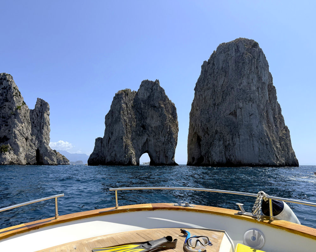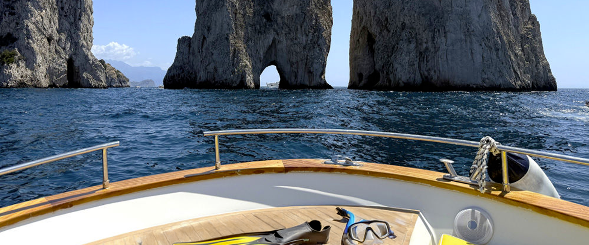 Non mancherà il tempo per tuffarsi: ci fermeremo per circa 30 minuti a Cala Ventroso per una sessione di snorkeling con i Faraglioni a fare da sfondo. Continueremo il tour ammirando Marina Piccola, l'Arco Naturale e la Grotta Bianca. Guardando con attenzione, all’interno della grotta potremmo scorgere una formazione rocciosa naturale che ricorda la figura della Madonna.