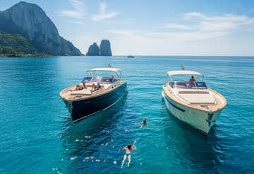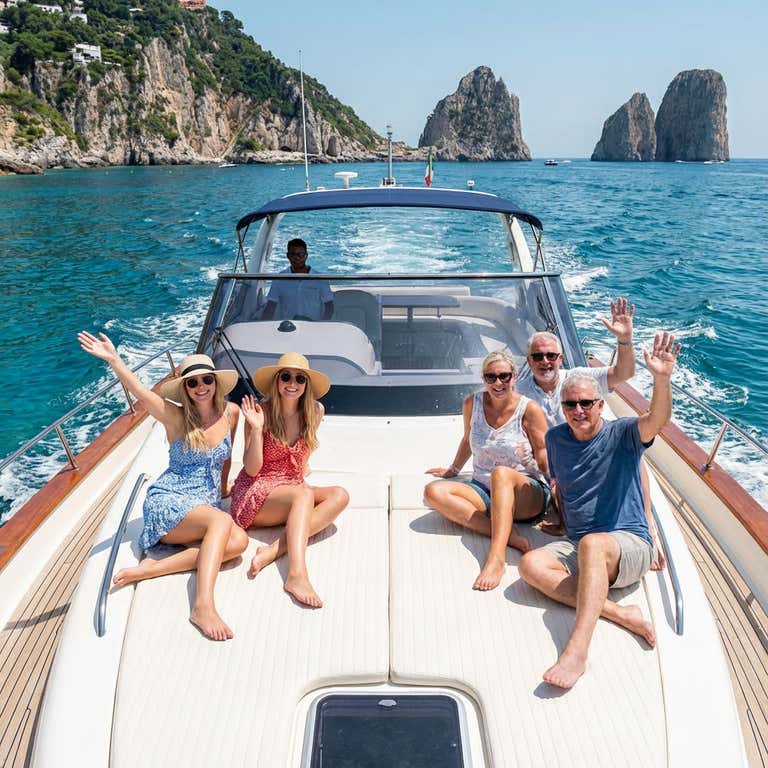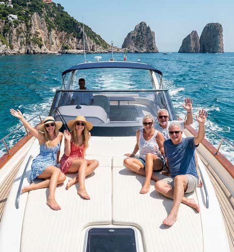 Riprenderemo il giro passando davanti alla Grotta dell'Arsenale, alla Grotta dei Marinai e ai leggendari Faraglioni. La navigazione continuerà verso Villa Malaparte, la Grotta Bianca, la Grotta Meravigliosa, la Grotta Rossa, il panoramico Salto di Tiberio e la Statua dello Scugnizzo. Durante il percorso, faremo altri brevi stop bagno di pochi minuti per goderci ogni sfumatura dell'acqua caprese.