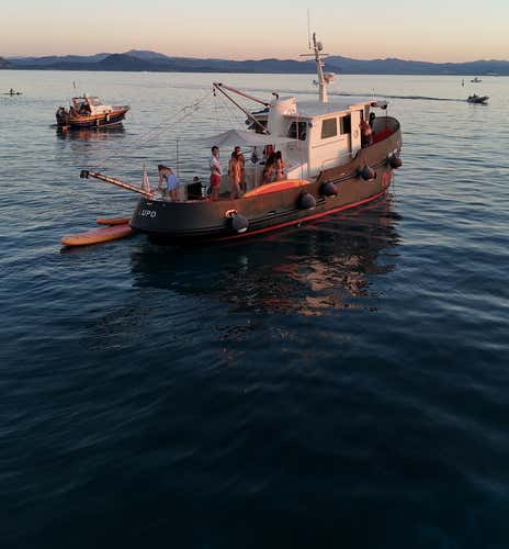 L'imbarcazione è un rimorchiatore storico di 15 metri, restaurato con ampi spazi prendisole, zone d'ombra, cuscineria, servizi igienici, doccetta, cucina e impianto stereo. A bordo troverai anche SUP, maschere e boccagli per praticare snorkeling. A bordo è preferibile restare scalzi.