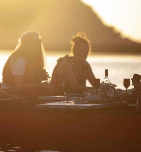 Potrai anche gustare un aperitivo di prodotti tipici in acqua mente ti godi lo spettacolo del tramonto.