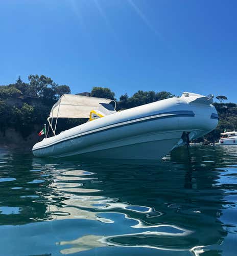 L'imbarcazione è un gommone Miramare Sunrise 7 Comfort lungo 7,5 metri e dotato di prendisole a poppa e prua, tavolino, tendalino e doccetta di acqua dolce.