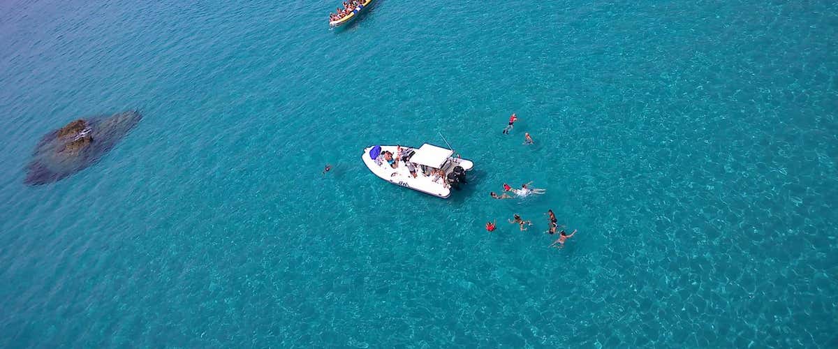 Ci fermeremo prima nei pressi della Grotta dello Scheletro, così definita perché il gioco di luci all'interno fa diventare la pelle dei nuotatori così bianca da sembrare cadaverica. Faremo snorkeling circondati da banchi di occhiate e risaliremo sul gommone per raggiungere la seconda tappa snorkeling: la Grotta Azzurra. Ci tufferemo direttamente nelle acque turchesi della grotta da un canyon.