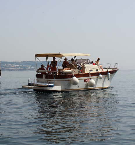 Sarai a bordo di un gozzo in vetroresina dotato di ogni comfort, tra cui tendalino, prendisole, borse frigo, doccetta e cuscineria. I passeggeri possono portare in barca cibo e bevande.