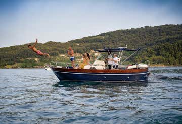 Si viaggia su un tipico gozzo sorrentino Blue di 8 m, in grado di ospitare sino a 7 passeggeri, e dotato di tendalino, doccetta d'acqua dolce, WC, frigorifero, cucina, impianto stereo, prendisole con divanetto e tavolino per mangiare.