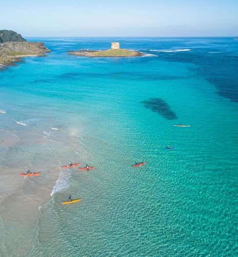 Lungo il tragitto, tra una pagaiata e l'altra, avrai modo di ammirare la spiaggia di Balai, con la sua caratteristica chiesetta sul mare, e di ascoltare le storie e le leggende di questo tratto di costa. Sei dei nostri?