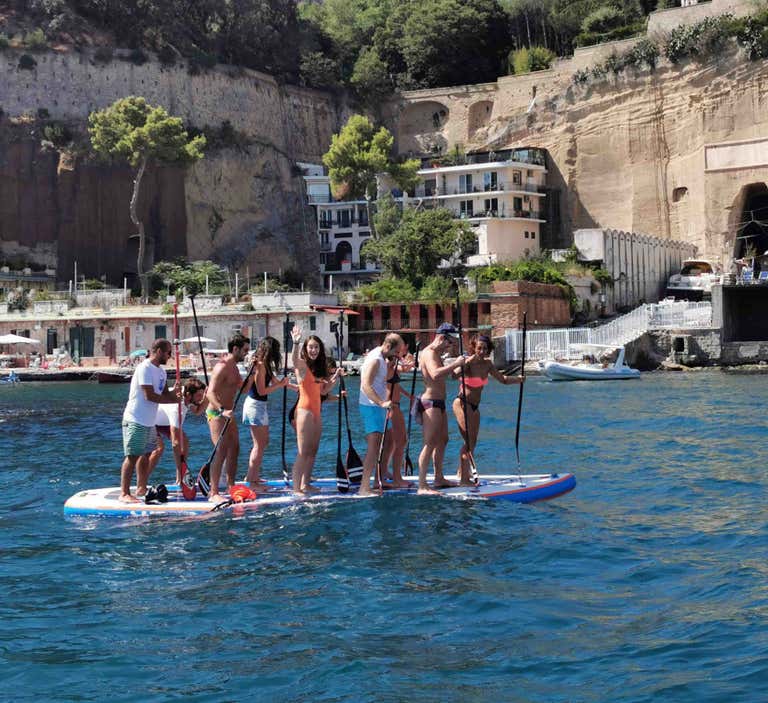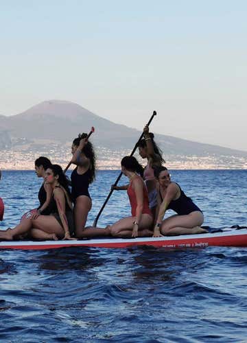 Goditi la bellezza del tramonto sul Golfo di Napoli pagaiando su un SUP gigante insieme ai tuoi amici.