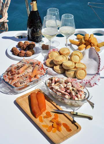 All'ora di pranzo, l'equipaggio preparerà un ricco aperitivo (incluso) a base di specialità locali, accompagnato da Prosecco DOCG e vino Vermentino.