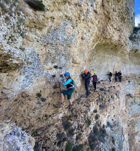 Raggiunto l'attacco della ferrata, la guida terrà un breve briefing sulla sicurezza e sulle tecniche di progressione, poi inizieremo il nostro percorso. La Via Ferrata di Giorrè è caratterizzata da pareti alte fino a 70 metri: si sviluppa su cenge e gradini naturali rocciosi, con un andamento prevalentemente orizzontale e alcuni tratti verticali.