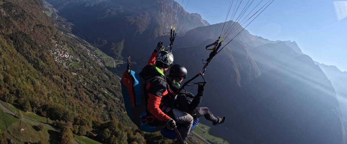 Sperimenta la sensazione unica di un volo tandem in parapendio in Svizzera. Raggiungi con l'istruttore il punto di decollo sul Monte Carasso a 1300 m di altezza; per farlo dovrai prendere prima la funivia e poi fare un piccolo tratto a piedi.