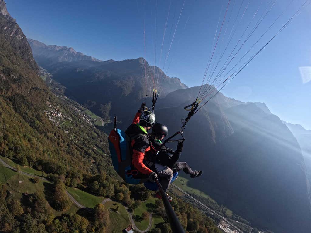 Sorvoleremo le tre fortezze con le loro imponenti mura e per 30 minuti ci godremo l'emozione del volo in parapendio, con ai piedi un paesaggio davvero incantevole. Sulla nostra sinistra potremo ammirare le Valli dei Grigioni e sulla nostra destra lo specchio d'acqua del Lago di Locarno.