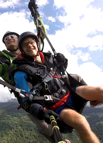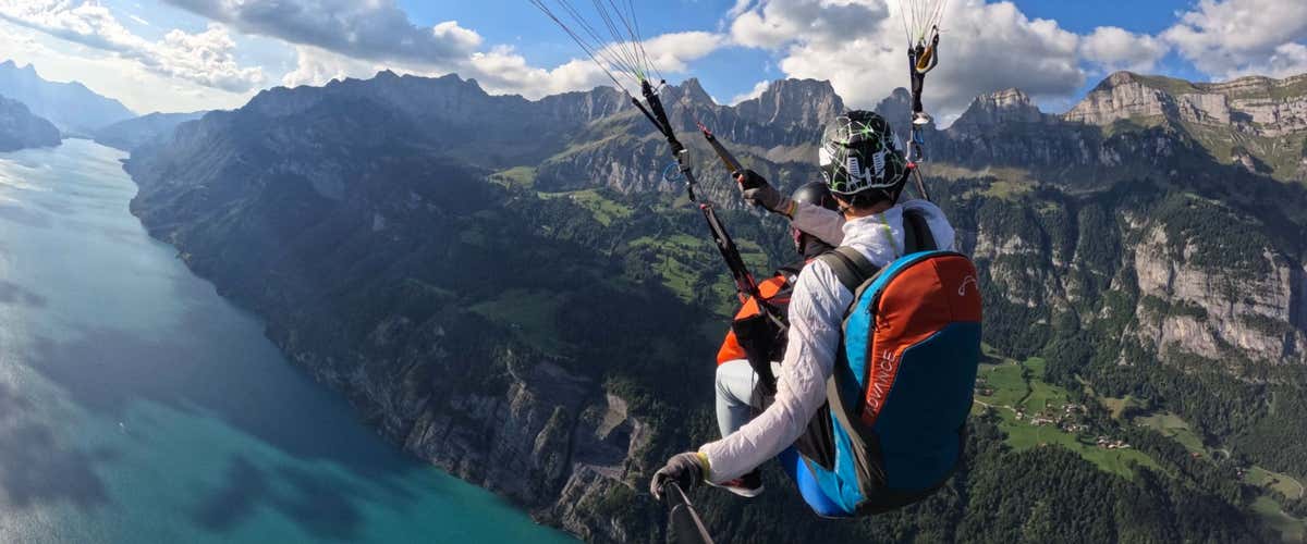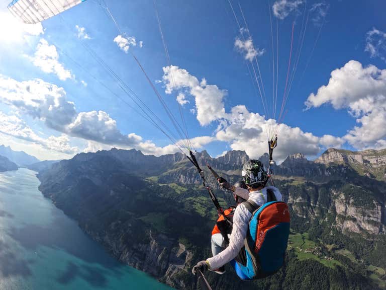 Una volta imbracato al pilota, sarai pronto per la piccola corsetta funzionale al lancio. Sorvolerai un panorama mozzafiato e ammirerai dall'alto il Lago di Lugano e il Lago Maggiore, la vetta del Monte Generoso e persino la Pianura Padana. Ti godrai l'emozione di volare per 15 minuti.