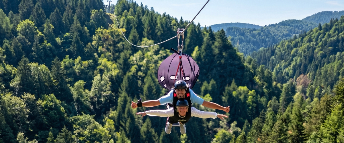 Partirete dalla rampa di lancio a 730 m d'altezza e percorrerete un dislivello di oltre 400 m verso il basso, fino ad arrivare a 310 m da terra. Volerete in posizione prona, con le braccia lungo il corpo per avere la massima aerodinamicità e raggiungere il picco di velocità di 172 km/h. Se siete una coppia, non potrete perdere l'occasione per darvi il bacio più veloce e adrenalinico che ci sia!