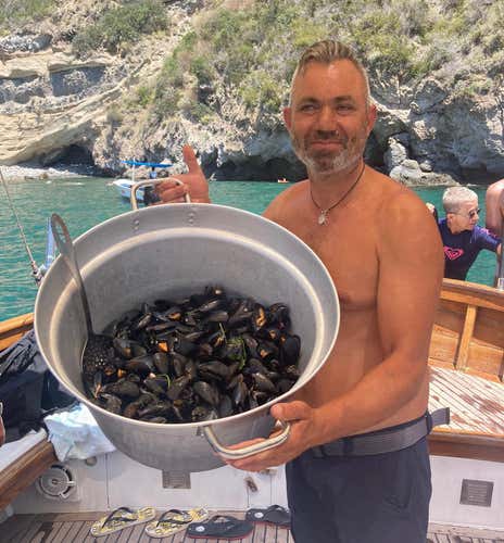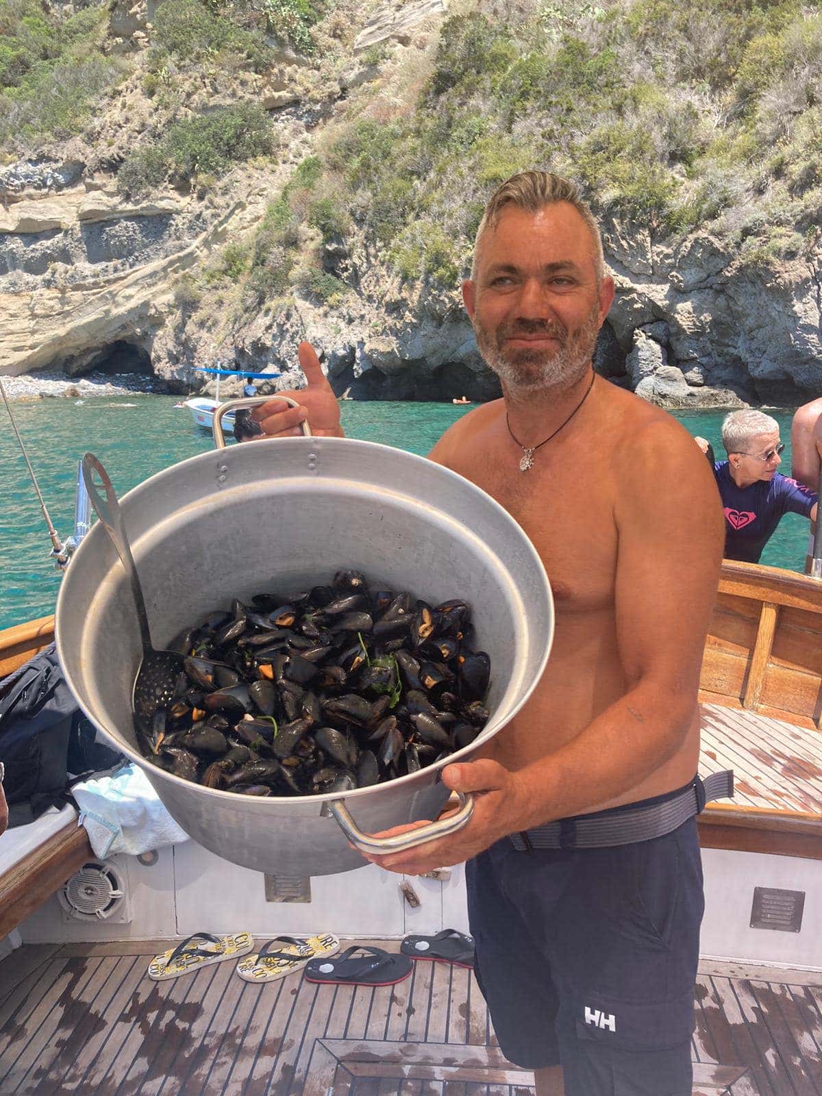 Navigation will then resume towards Sant'Angelo, an ancient fishing village and the destination of the second stop. Here, too, there will be refreshments with bruschetta (included). The third stop will be at Sgarrupata, a magical place on the island with a very high coastline overhanging the sea. Between a dip and a swim, we will enjoy our lunch (included), which will consist of a fish or vegetarian starter and mussel soup.