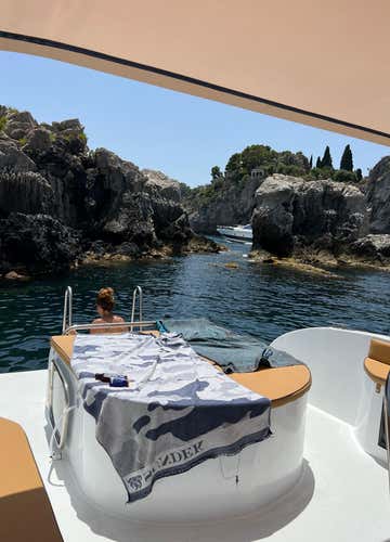 We will board the boat and start sailing along the coastline towards the beautiful Bay of Taormina.