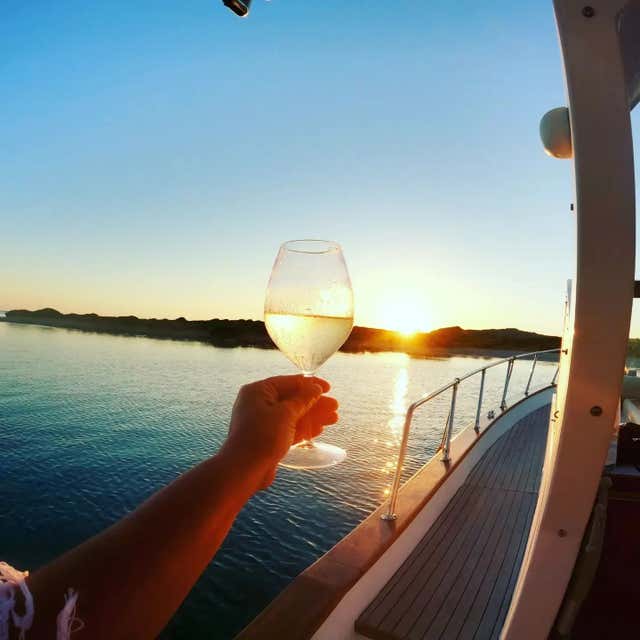 As the sun sets, we will enjoy anaperitif on board with a platter of cold meats and cheeses, spritz and Vermentino wine. After the happy aperitif, we will return to the starting point around 9.30 pm.