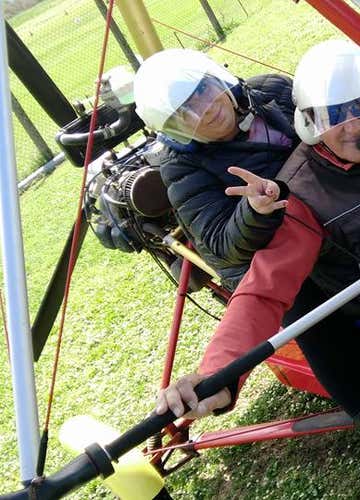 Upon your arrival, I will introduce you to my flight school and accompany you to the aircraft, whose operating principles and all useful information for our flight I will explain. The aircraft is a powered hang glider model Air Creation Clipper GTE 912, equipped with a pilot's seat and a passenger seat positioned behind the first; we will be able to communicate thanks to the helmet with intercom.