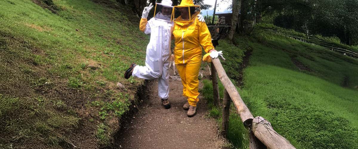 Once we have donned the suits and gloves (included) that will prevent any stings, we will walk to the apiary and watch a demonstration of the procedures that are done daily to check that the bees are well. As the beekeeper works, he will explain to us the basic steps and tools for his job!