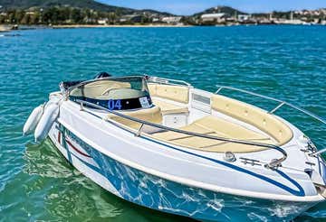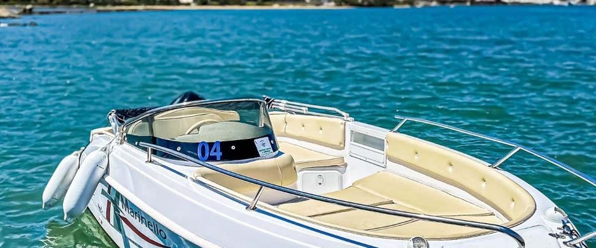 This boat is 5.30 metres long and equipped with a Suzuki 40 HP engine; it is ideal for groups of up to 6 people. The equipment includes a central console, safety devices, and all on-board comforts such as a bow sundeck, cushions, and a sun canopy.