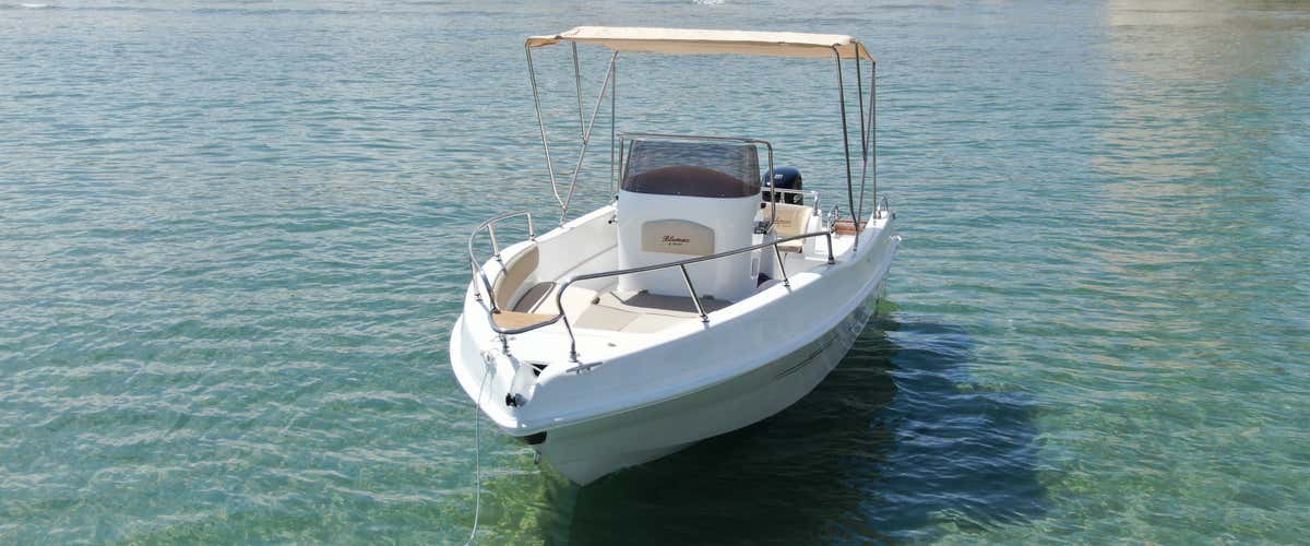 The boat is a 5.70-metre-long Bluemax motorboat with a 40 HP engine and equipped with an awning, sundeck, cushions, and a climbing ladder. You will be able to bring food and drinks on board to toast with your company.