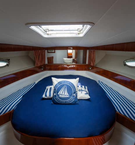 The 12-metre-long boat is equipped with all comforts for pleasant sailing: sundeck, awning, shower, hot water, bathing ladder, sofa, table, fridge, toilet and stereo system.