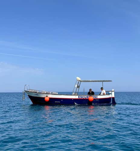 Theboat is an 8-metre long Sicilian gozzo, equipped with an awning and shower. On board one remains barefoot. Dogs are not allowed on board.