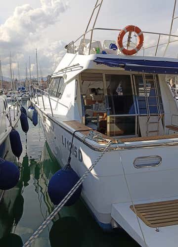 - a 14 m motor boat with a maximum capacity of 12 persons and equipped with awning, table and sofas, ladder, platform, freshwater shower, sundeck, dinghy and air conditioning.