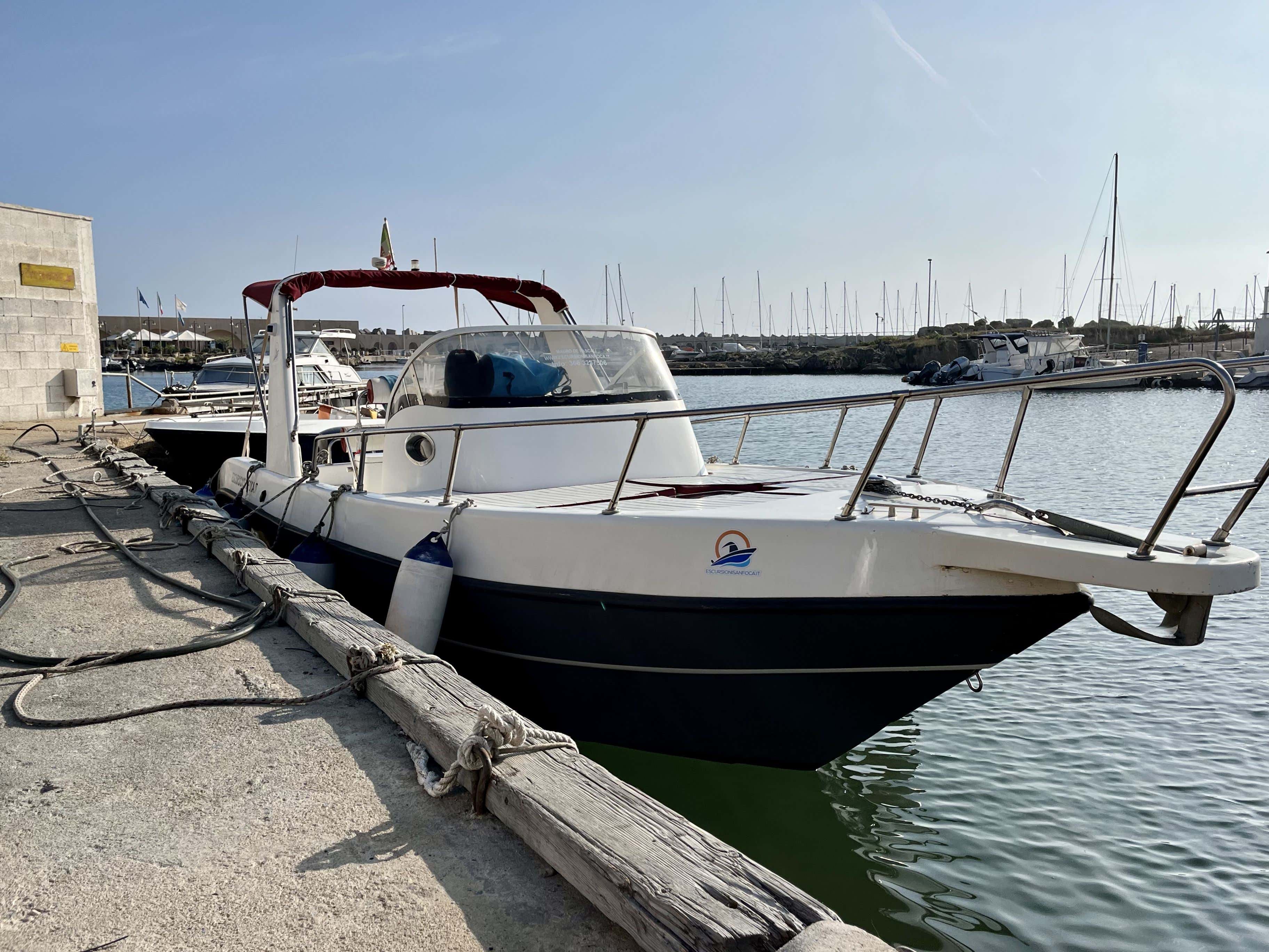 Once we have finished boarding all the passengers, we will set sail. We will bid farewell to the beaches of San Foca, a Blue Flag award-winning destination, and head for Roca Li Posti. Here we will find the Sanctuary of Madonna di Rosa and Roca Vecchia to welcome us; we will also pass by the Grotta della Poesia, known as the 'most beautiful natural swimming pool in the world'!