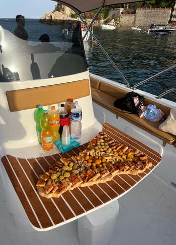 Theboat on which the experience will take place is a 10-metre-long motorboat equipped with cushions, awning, sundeck, climbing ladder, freshwater shower and toilet. It is necessary to remain barefoot on board.