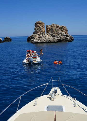 The motor boat, christened Chicca, is 12 metres long and is equipped with a large awning, a rooftop sun deck with comfortable cushions, a sundeck at the bow, a freshwater shower, toilets and a stereo for music on board. Snorkelling sets, life jackets, boards and swimming aid sets are also available to passengers.