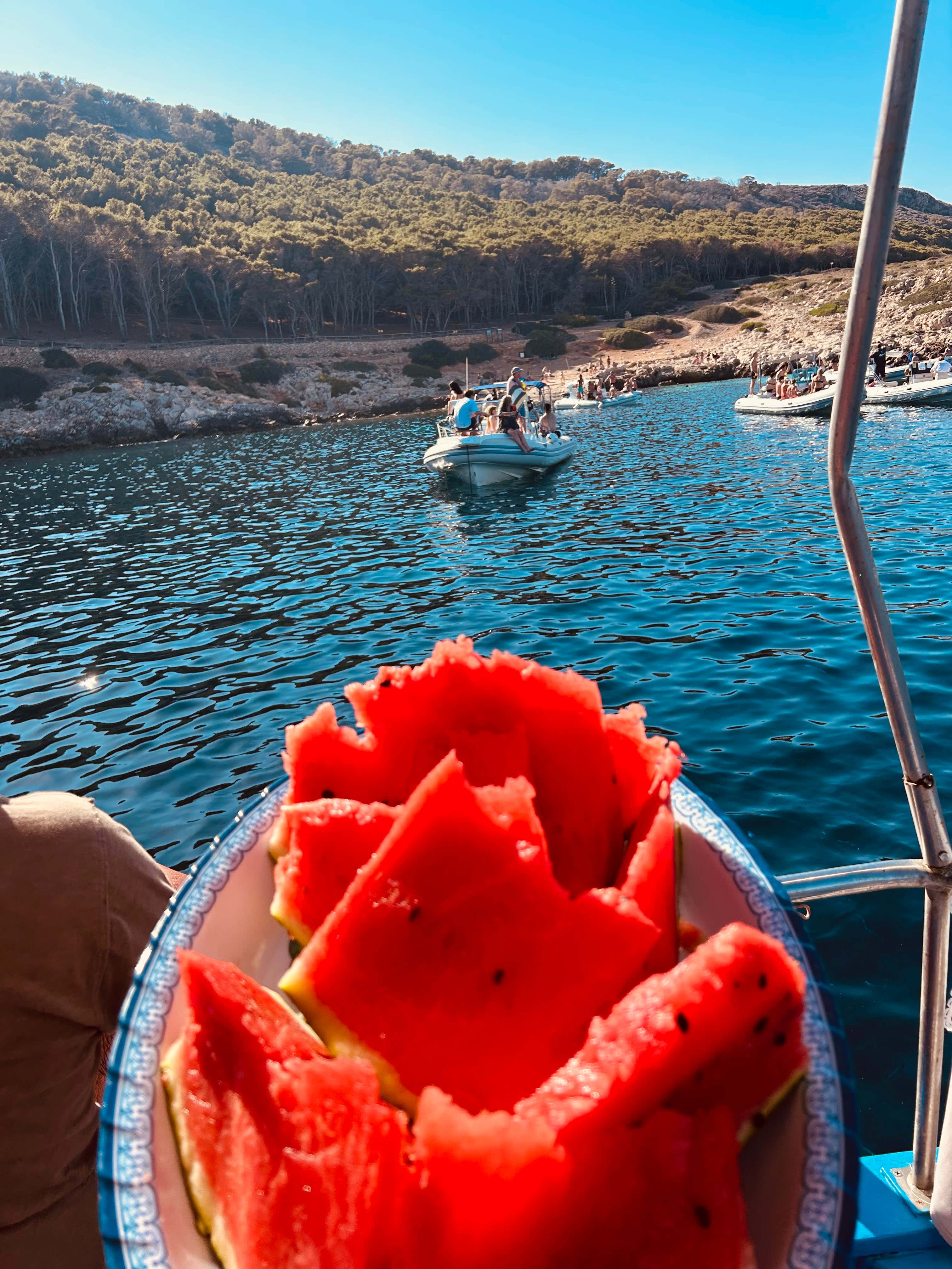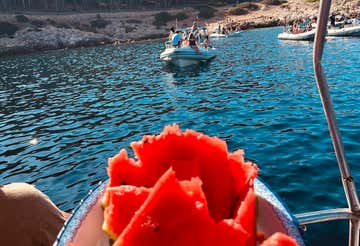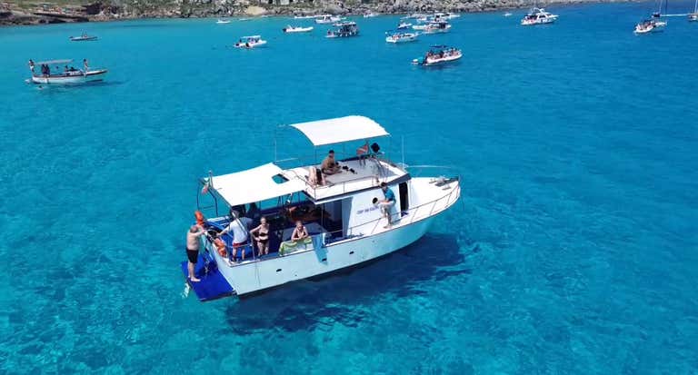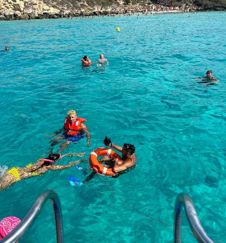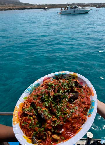 The excursion will include 5 swimming stops of 25-30 minutes at each of the points indicated (or others chosen by the skipper depending on weather and sea conditions). Between a swim and a postcard photo, there will be a tasty lunch on board with pasta allo scoglio, accompanied by wine and soft drinks, and fruit as a snack in the afternoon.