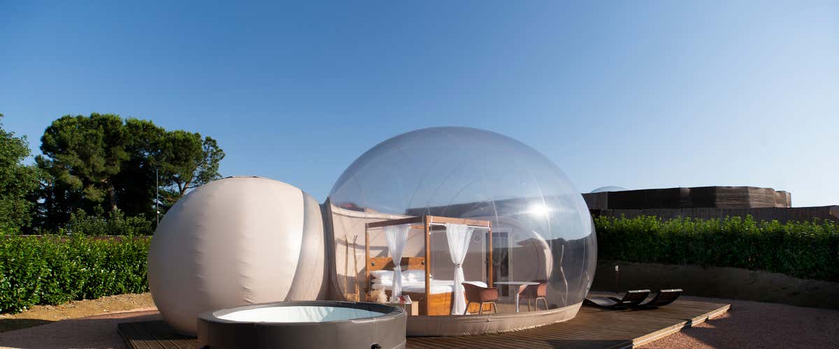 The structure has two twin transparent domes, Alba and Aurora, each surrounded by a large private area, fenced and screened by hedges and bamboo to guarantee maximum privacy. Inside the Bubble Room you will find a wooden four-poster bed, private bathroom with shower, toilet and sink, heating, air conditioning, mini fridge, kettle for tea and herbal teas and Welcome Kit with towels, terry bathrobe, slippers, organic soaps and hairdryer.