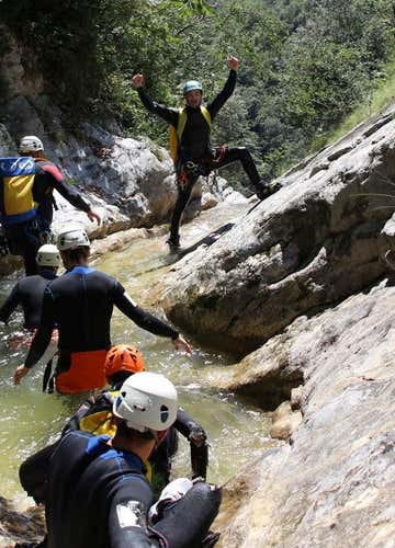 We will walk along the upper section of the Vione stream, covering a length of 2 km and an altitude difference of 400 metres. We will encounter 12 waterfalls and several toboggans (natural slides). We will dive into crystal-clear pools by jumping from 2 to 10 metre high rocks (diving is not obligatory). And finally, we will tackle a majestic rock face by abseiling down a good 60 metres!