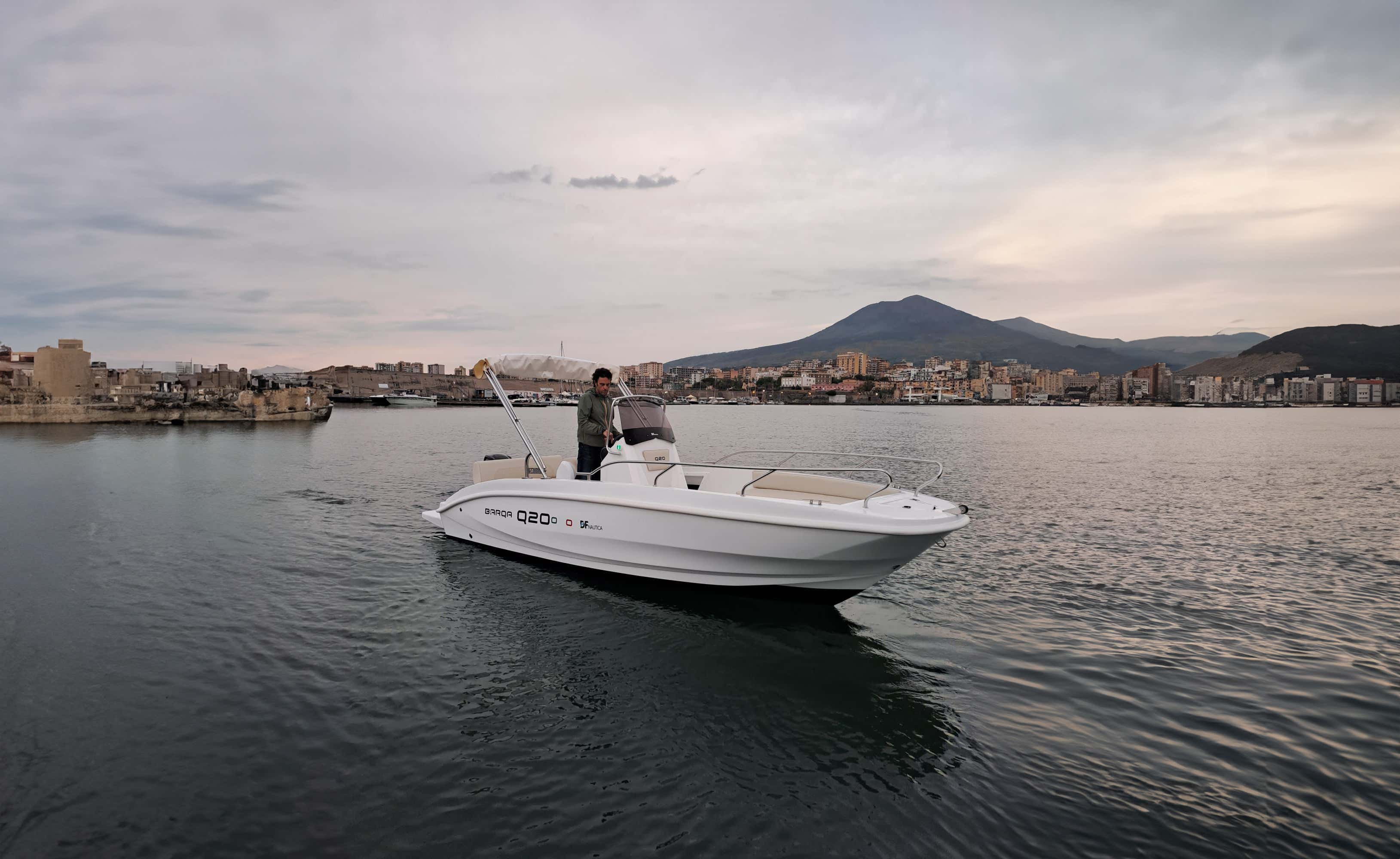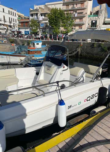 The boat is a Barqa Q20 motor boat, 6. 35 m in length, with a 40 HP engine and equipped with awning, ladder, bow and stern sundeck, freshwater shower and Bluetooth system.