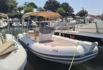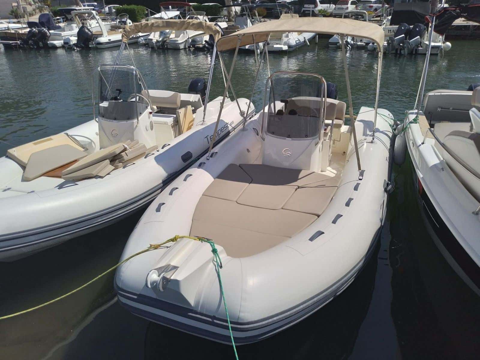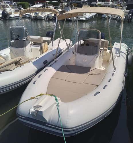 The boat is the 6-metre long Capelli Tempest 600 dinghy with a Yamaha 40 HP engine, equipped with electric starter, steering console, safety equipment within 3 miles of the coast, sun cushions, awning, climbing ladder, shower system, stereo system and icebox.