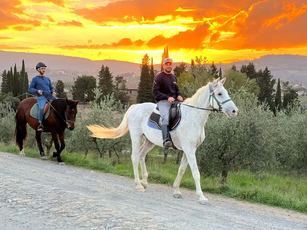 Once we reach the riding school, we will be ready for our horseback ride. After a short briefing, we will mount the saddle and begin our horseback ride through lush vineyards, native forests, olive groves and hillsides where the famous Chianti wines are produced. During theapproximately one-hour ride we will enjoy the calm of the Tuscan countryside, its colours and scents, proceeding leisurely at a leisurely pace.