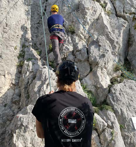 We will then proceed with a series of ground exercises, in a horizontal position, which are preparatory to climbing and are inspired by the Caruso teaching methodology, followed by the instructor. After warming up and learning a little, we will begin the actual climbing.