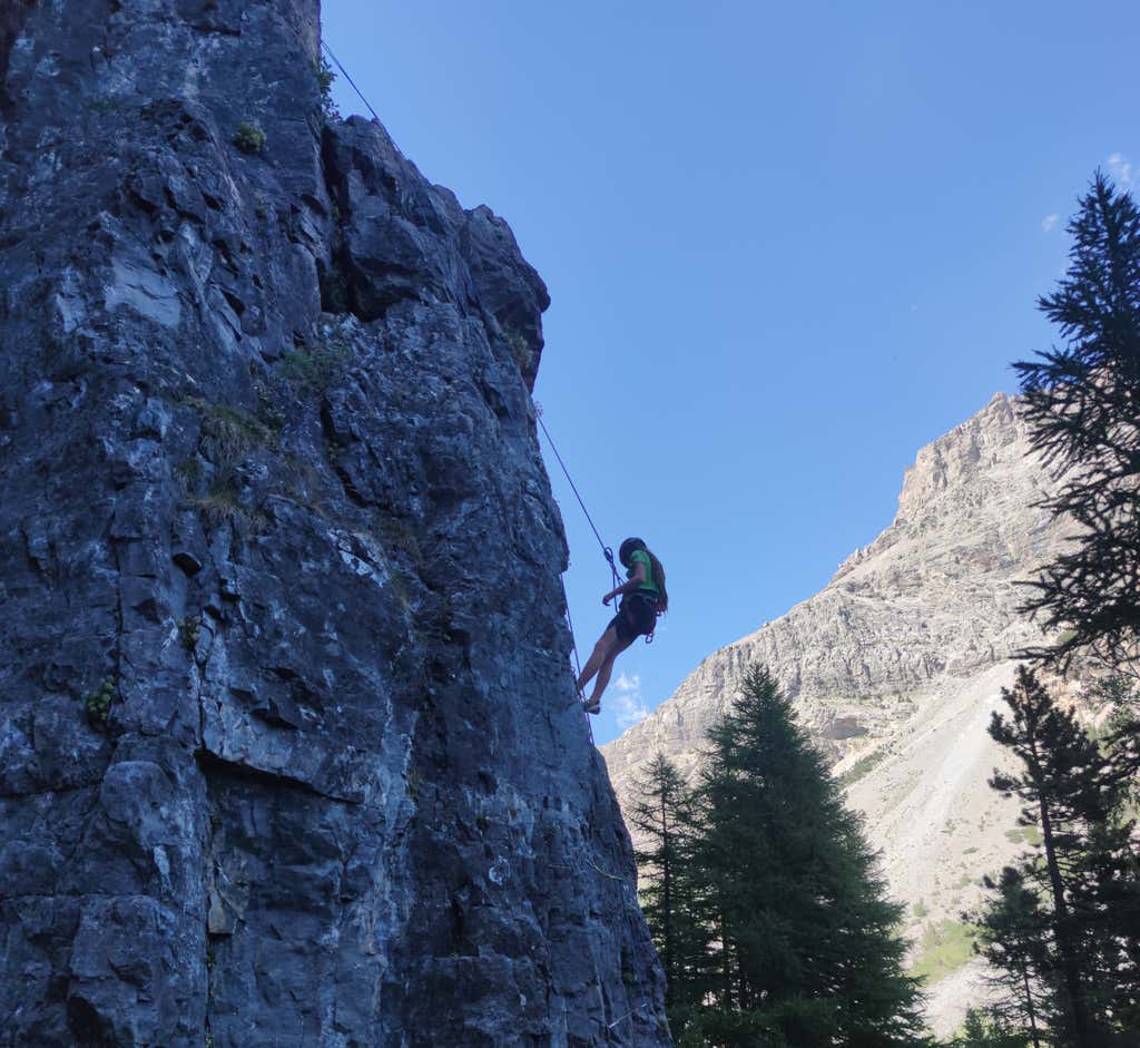 And here we are ready to climb: in pairs and alternating, 1 participant will start climbing and 1 participant will stay on the ground to support him/her in the venture. We will climb on dolomite or serpentine rock walls around 25 metres high, which can be climbed several times over the course of the lesson, putting ourselves to the test. All in a beautiful natural setting, guided by the presence of the Guglia Rossa!